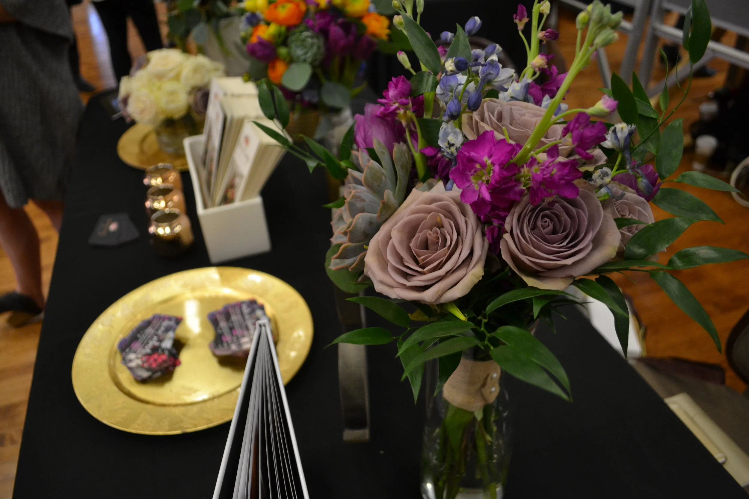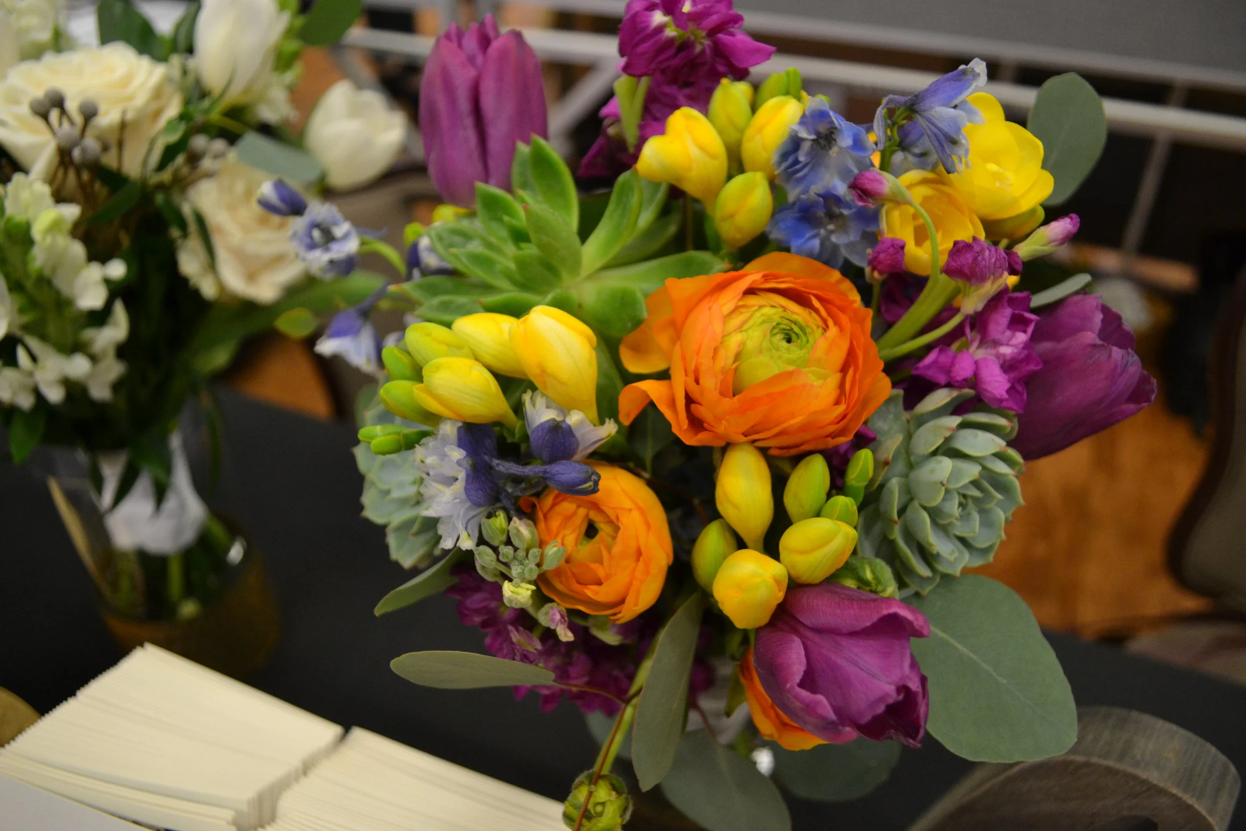 This past weekend we attended The Classic Elegance Bridal Expo in West Lafayette for the first time as Honey & Sage Flower Studio, LLC. It was tiring and stressful at times, but it was also super exhilarating and we had so much fun! For the show, we decided we wanted to create several completely different bouquets. We wanted to be sure that every bride knew we could create custom and unique works of art for their big day. While we are always happy to work from a photo or an exact vision, we pride ourselves on our ability to take even the vaguest of ideas and create a dream wedding that a couple didn't even know they were looking for. We made a stunning all white and green bouquet, designed with succulents, and even showed a bright bouquet with absolutely no roses, which is almost unheard of these days! We loved meeting all of the brides, and we were so grateful for the opportunity to introduce ourselves and our talents alongside the other amazing vendors at The Classic Elegance Bridal Expo!